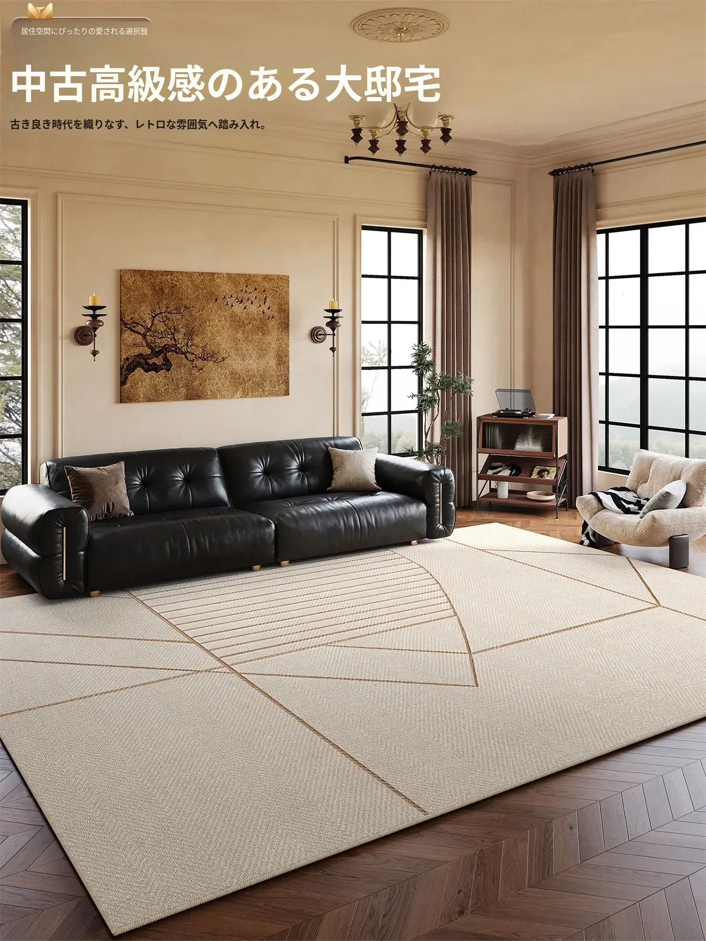 2025年新作!レトロスタイルの防水・防汚リビングカーペット - ソファやテーブルを守るお手入れ不要の高級感あふれる寝室用カーペット!